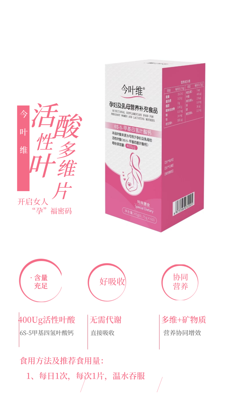 | 功能主治 | 补充孕期、哺乳期女性所需的活性叶酸基多种维生素,为母体健康和胎儿正常发育提供营养支持 |